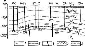 1 — стратиграфические границы; 2 — поверхности размыва отложений; 3 — дизъюнктивные нарушения; 4 — залежи газа; 5 — уровень структурного порога ловушки