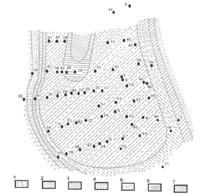 Figure 1. Geologic map of Kirmaku Oil Field (Modified after Alibekov et al., 1964). 1—Lower Balakhany Suite, 2—“Pereryv” Suite, 3—NKG Suite, 4—NKP Suite, 5—KS Suite, 6—PK Suite, 7—Pontian Stage.