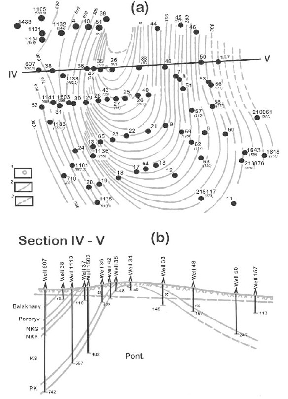 Figure 2. Structural map and cross-section of Kirmaku Oil Field (Modified after Alibekov et al., 1964). (a) Structural map on the top of Pontian Stage: 1—well, 2—contour line on top of Pontian, 3—outcrops of Pontian rocks; (b) cross-section.