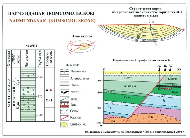 Газонефтяное месторождение Нармунданак (Комсомольское) находится в центральной зоне Южно-Эмбинской НГО. В структурном отношении месторождение приурочено к трехкрылому соляному куполу, на северном и южном крыльях которого в отложениях нижнего мела разведан апт-неокомский продуктивный горизонт. На южном крыле он содержит нефтяную, а на северном крыле структуры газовую залежи, экранированные сбросами центрального грабена.