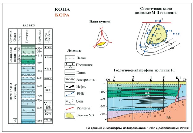 Нефтяное месторождение Копа находится на юго-западе Восточно-Прикаспийской НГО в пограничной зоне с Южно-Эмбинской НГО. В структурном отношении приурочено к одноименному трехкрылому соляному куполу. В присводовых условиях юго-восточного крыла на глубинах от 192 до 850 м в толще юрско-меловых отложений выявлены залежи нефти.
