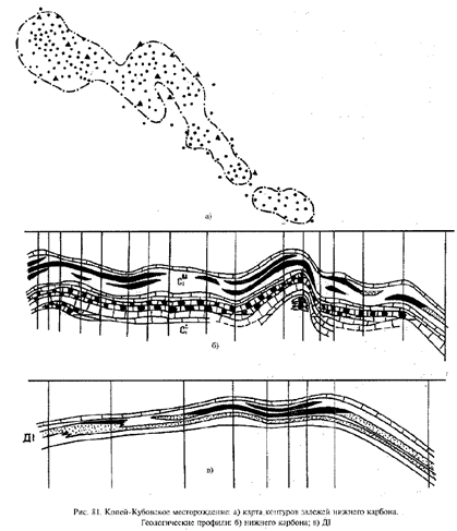 В турнейском ярусе, сложенном органогенно-обломочными глинистыми известняками, продуктивна верхняя часть кизеловского горизонта. В этом горизонте насчитывается 3 залежи. ВНК залежей кизеловского горизонта находится на отметках от -1090 до -1117 м. Залежи мелкие. В заволжском горизонте одна из 11 залежей имеет довольно большие размеры (до 5 по длинной и до 2 км по короткой оси). ВНК от -1167 до -1185 м. Большинство залежей небольшие. Проницаемость коллекторов, особенно пелитоморфных, очень низкая (менее 0,01 мкм2). Мощность продуктивной части кизеловского объекта до 9,0 м. Коллекторы составляют около половины объема. Мощность в заволжском горизонте больше, чем в кизеловском и достигает 23 м. В среднефаменском подъярусе нефтеносность связана с известняками пачки "Д" общей мощностью 28-35 м и нефтенасыщенной - до 25 м. Пористость известняков не превышает 3%, проницаемость 0,09 мкм2, однако в них сильно развита трещиноватость, вследствие чего начальные дебиты нефти достигали 150 т/сутки. В этой толще установлено 9 массивных залежей различного размера с этажом нефтенасыщения до17 м. ВНК от -1217 до -1248 м. Начальный гидродинамический режим упруговодонапорный.