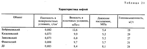 Основными объектами разработки являются бобриковский (2,8 млн. т НИЗ) и турнейский (2,1 млн. т). В целом по величине НИЗ месторождение относится к категории средних (7,5 млн. т). Все объекты практически разбурены и длительное время разрабатываются. Всего выделено 5 объектов разработки. Пробурено более 200 скважин различного назначения. Первоначально залежи разбуривались по равномерной треугольной сетке 400х400 м. Эксплуатация бобриковского и турнейского объектов предполагалась совместной. Характеристика нефтей приведена в табл. 21.