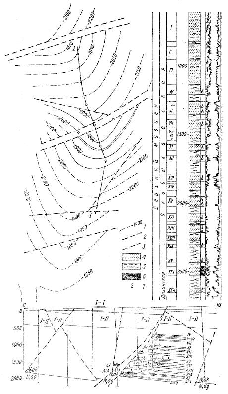 1-изогипсы по кровле ХХ пласта, 2- разрывы, 3-контур нефтеносности, 4,5 - песчаные, глинистые породы соответственно, 6- нефть, 7 газ