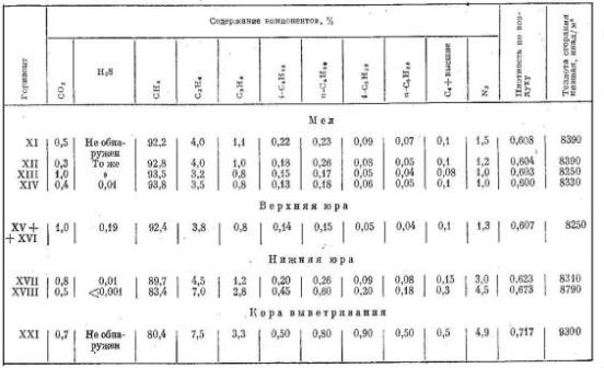 Составы газов в отложениях юры отличаются от состава газов меловых отложений несколько большим содержанием двуокиси углерода (до 1,5%), наличием сероводорода (до 0,2%) и неоднородностью углеводородного состава, содержание гомологов метана возрастает с глубиной залегания залежей. Наибольшее их количество (до 12 – 12,5%) содержится в газах III горизонта.