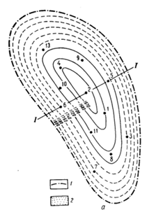 Условные знаки: 1 – контур газоносности; 2 – газ