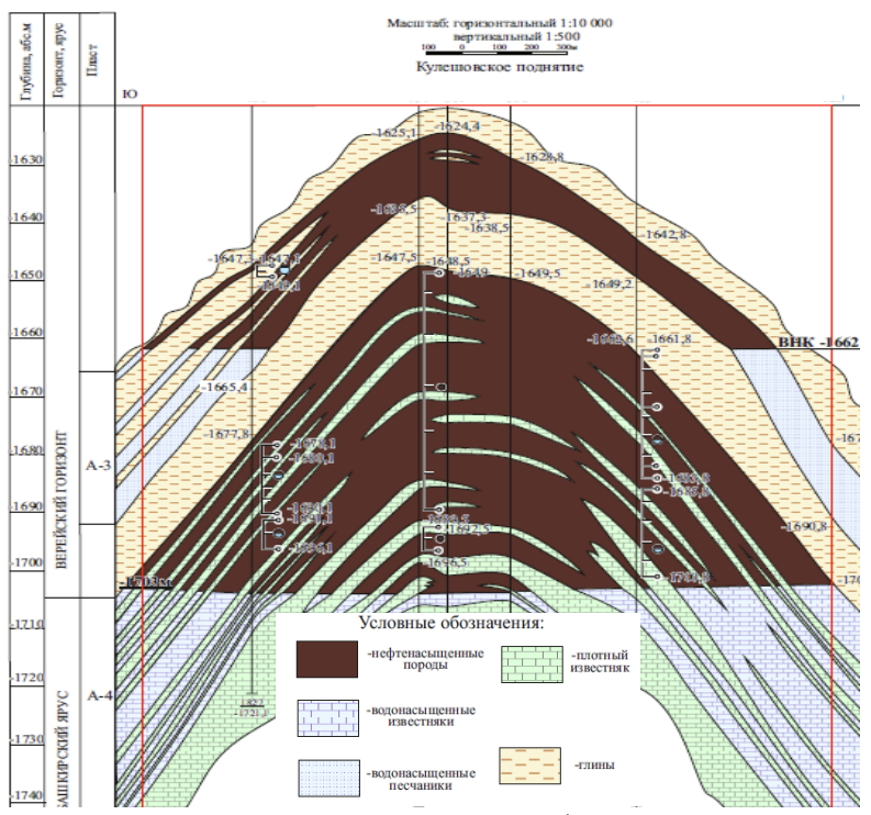 Пласт А4 башкирского яруса выделяется в кровельной части башкирского яруса и сложен, в основном, мелкокристаллическими, кавернозными и участками трещиноватыми известняками. Пласт отличается значительной неоднородностью. Изолирующей покрышкой служат глины верейского горизонта. На Кулешовском участке пласт А4 промышленно нефтеносен на Западном и Центральном куполах, а также на Благодаровском поднятии. Залежи массивного типа. В пределах нефтенасыщенной части на Благодаровском поднятии пласт состоит из 1–5 проницаемых прослоев, а толщина этих прослоев изменяется от 0,6 до 16,6 м. Эффективная нефтенасыщенная толщина пласта меняется от 1,8 до 17,8 м, пористость 11—34 %, проницаемость 0,044—0,108 мкм2 . Геолого-литологический профиль продуктивных пластов А-3 верейского горизонта и А-4 башкирского яруса [15] 42 3.2.5