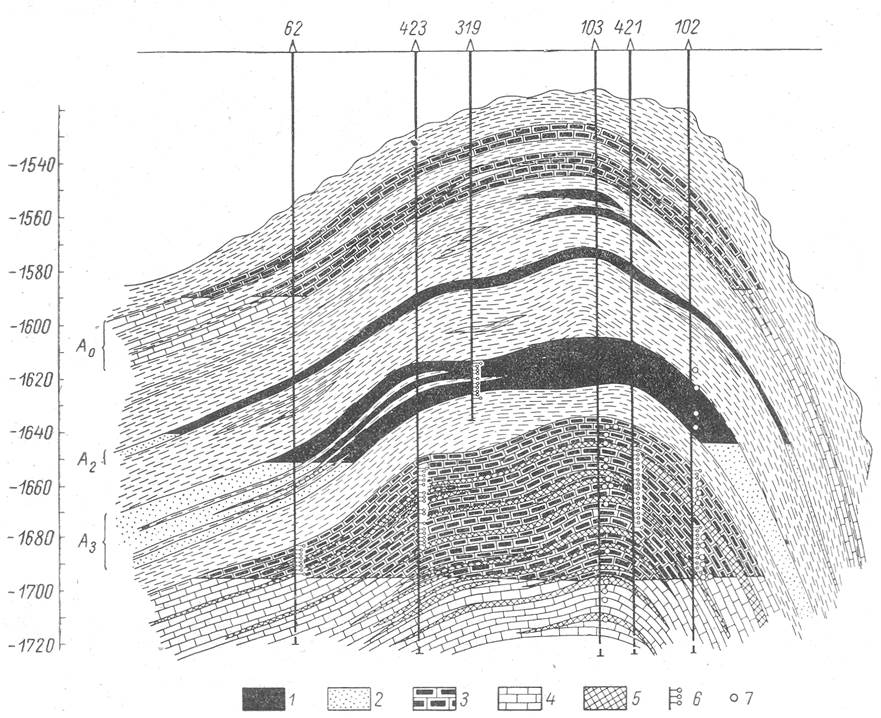 Песчаники: 1 - нефтеносные; 2 - водоносные. Известняки: 3 - нефтеносные; 4 - водоносные; 5 - уплотненные участки пласта; 6 - интервал перфорации; 7 - отмеченная открытая трещина.