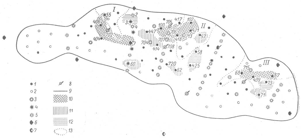 Скважины: 1 - пробуренные, эксплуатирующие пласт А4; 2 - проектные эксплуатационные; 3 - эксплуатационные, резервные первой очереди бурения; 4 - нагнетательные, пробуренные и находящиеся в бурении; 5 - нагнетательные проектные. Пьезометры: 6 - пробуренные; 7 - проектные; 8-скважины контрольные; 9 -контур нефтеносности. Зоны со степенью трещиноватости: 10 - с высокой; 11 - со средней; 12 - с низкой; 13 - обводненные зоны.