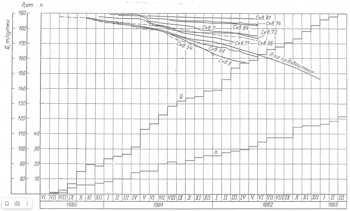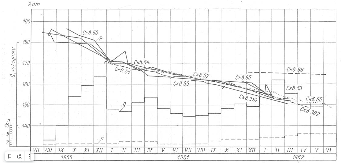 n - число скважин; Q - отбор нефти, т/сутки, Р - давление, ат. Кривые скважин показывают динамику давления во времени.