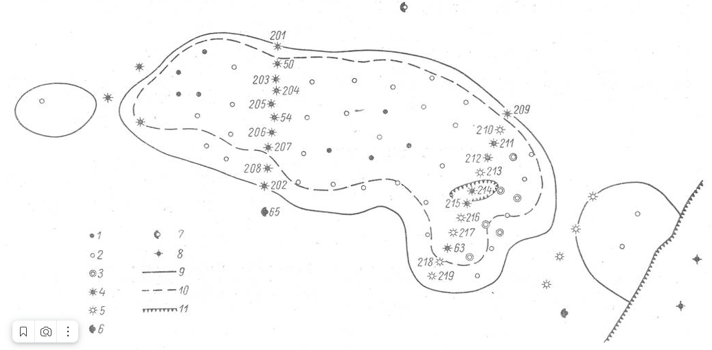 Пьезометры: 6- пробуренные; 7 - проектные. Контур нефтеносности: 8 - внешний; 9 - внутренний; 10 - линия выклинивания пласта; 11 - линия выклинивания пласта.