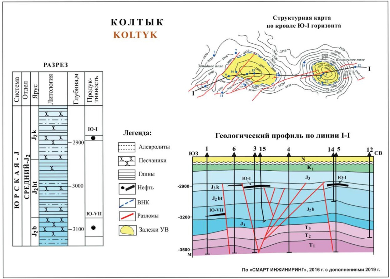 Нефтяное месторождение Колтык расположено в западной части Северо-Устюртской НГО, в Колтыкском прогибе, раскрывающимся в Прикаспийскую впадину. Выявленная здесь антиклинальная складка нарушена малоамплитудными разломами. Выделяются две вершины, к которым приурочены западное и восточное продуктивные поля. Установлена продуктивность келловейских и батских отложений.