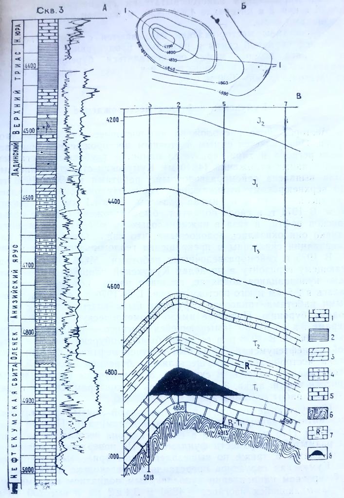 Рис.1. Месторождение Кумухское. А- геолого-геофизический разрез; Б- структурная карта по поверхности нефтекумской свиты; В- профильный геологический разрез. 1- песчаники; 2- аргиллиты; 3- мергели; 4- известняки глинистые; 5- доломиты; 6- породы палеозойского фундамента; 7- реперная пачка в основании яруса; 8- залежь нефти.