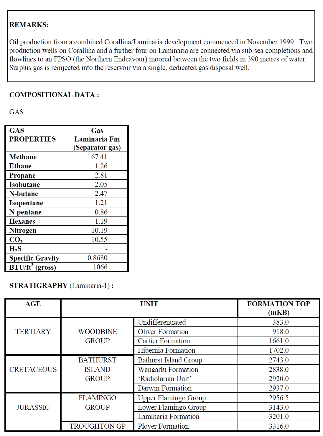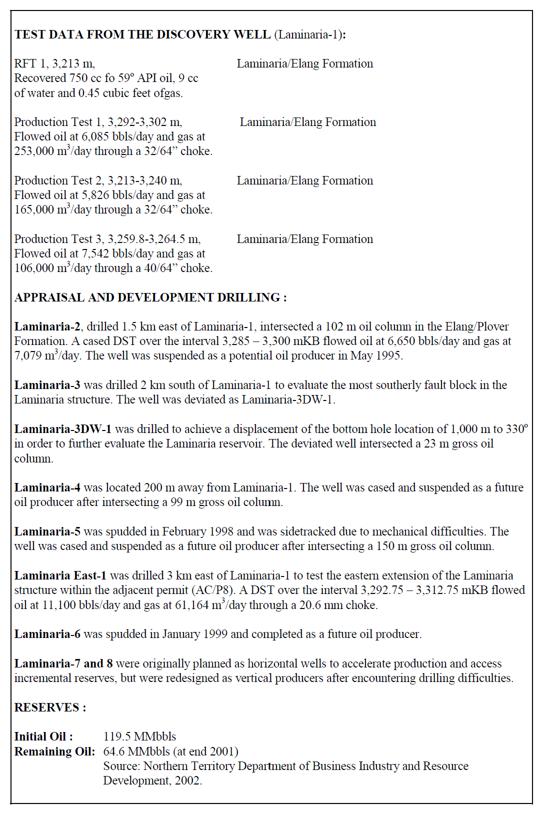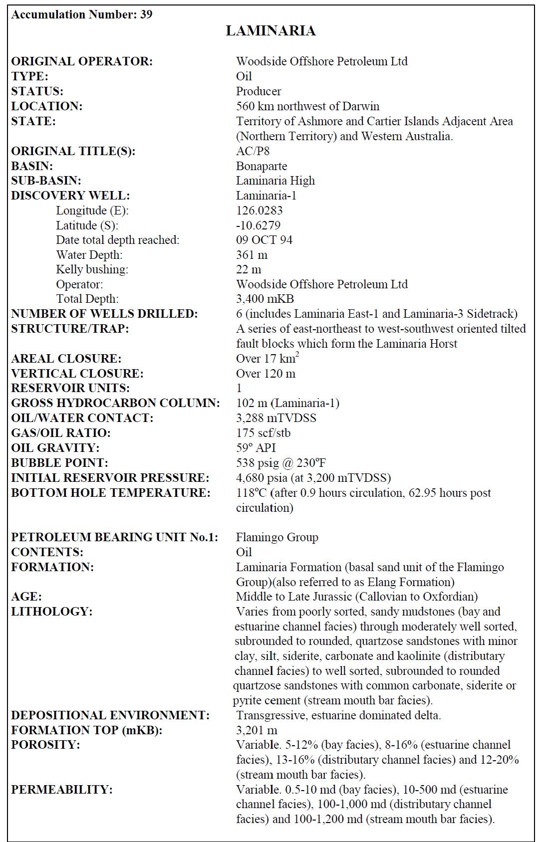 The well intersected a 102 metre gross oil column within the Elang / Laminaria Formation. At date of writing, a further 9 appraisal / development wells had been drilled on the Laminaria structure, including one deviated well. The Laminaria oil field was found to extend into adjacent exploration permit WA-260-P (production license WA-18-L) and a unitisation agreement was finalised between the permittees of AC/P8 and WA-260-P in 1998.