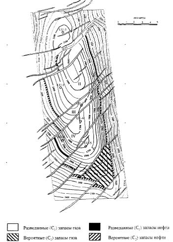 В I блоке установлено 9 пластовых, тектонически экранированных газоконденсатных залежей. Размеры залежей меняются в пределах: длина- от 5,75 (1 пласт) до 4,2 км (XVII); ширина - от 4 (1) до 2,5 км (Va); высота - от 110 (XVI) до 30 м (XVII). Пористость (по ГИС) уменьшается с глубиной с 25 (I, II, IV) до 16% (XVII), газонасыщенность - с 65 (I) до 48% (XVII), проницаемость, определенная по гидродинамическим данным, меняется в пределах 8-430*10-3 мкм2 (верхние пласты имеют лучшие показатели).