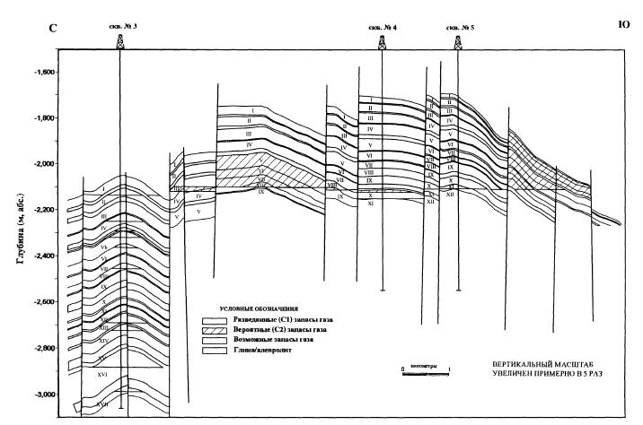 Вверх по разрезу складка выполаживается, углы падения равны 3-4 °. На месторождении в 15 пластах открыто 11 залежей, из них 10 залежей газоконденсатных (в пластах I, II, IV, V-a, V-б, V-XI-XII, ХШ, XIV-б, XVI и XVII) и одна газоконденсатная с нефтяной оторочкой (пласты I-IV во II-V блоках).
