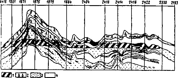 Рис. 1. Лянторское нефтегазоконденсатное месторождение. Геологический разрез пласта АС11: 1, 2, 3 — песчаники соответственно нефте, газо-, водонасыщенные; 4 — глинистые пропластки