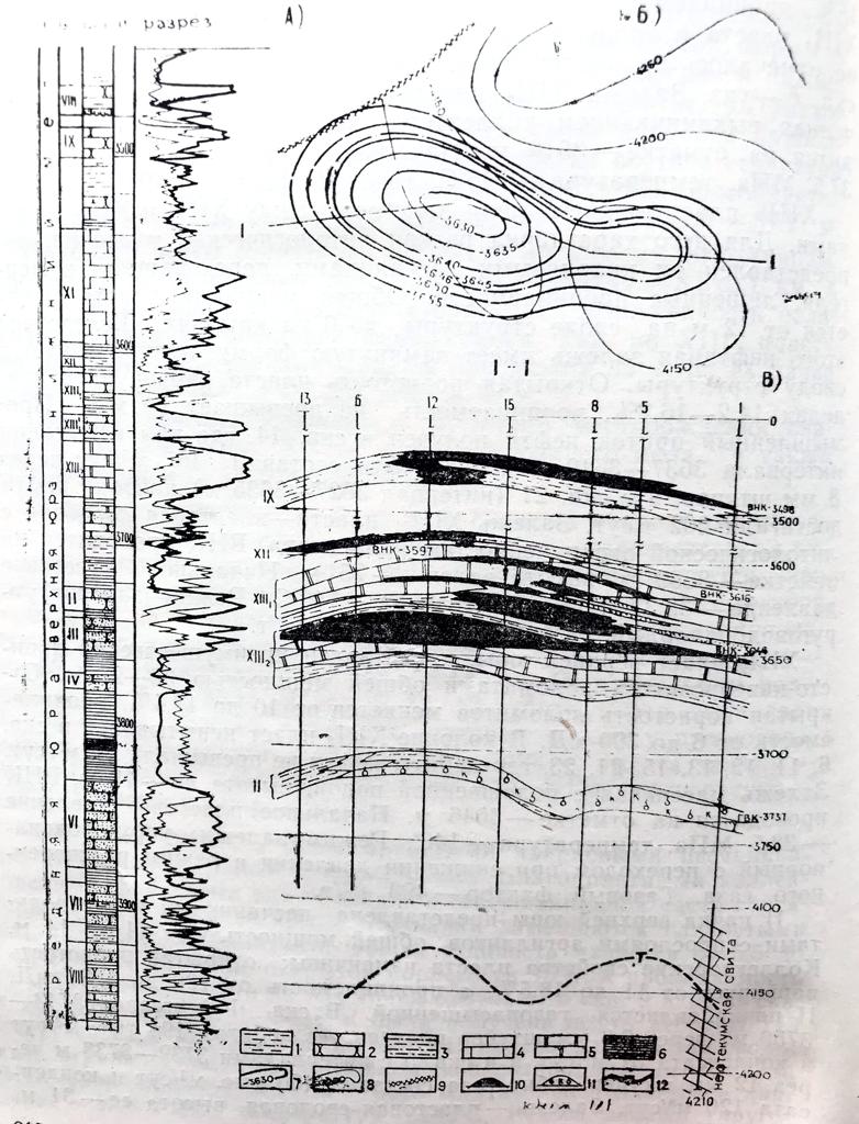 XII пачка сложена мелкозернистыми кварцевыми песчаниками, переслаивающимися с аргиллитами. Благоприятными коллекторскими свойствами она обладает в северо-западной части структуры, а на южном ее крыле песчаники замещаются глинистыми доломитами и аргиллитами. Общая мощность меняется от 5,5 до 1 м, среднее значение открытой пористости 15%, а проницаемость - 68 мД. Притоки нефти из XII пачки отмечены в скв. 9 и 12. В скв. 9, из интервала 3611-3615 м была получена нефть дебитом 143 м3/сут через 6 мм штуцер. Залежь XII пласта - пластовая сводовая, ограниченная выклиниванием коллектора, высота ее - 27м, ВНК проводится на отметке - 3615 м. Начальное пластовое давление - 36,6 МПа, температура - 145°С. Режим залежи упруговодонапорный с переходом при снижении пластового давления в режим растворенного газа. Газовый фактор - 493 м3/т.