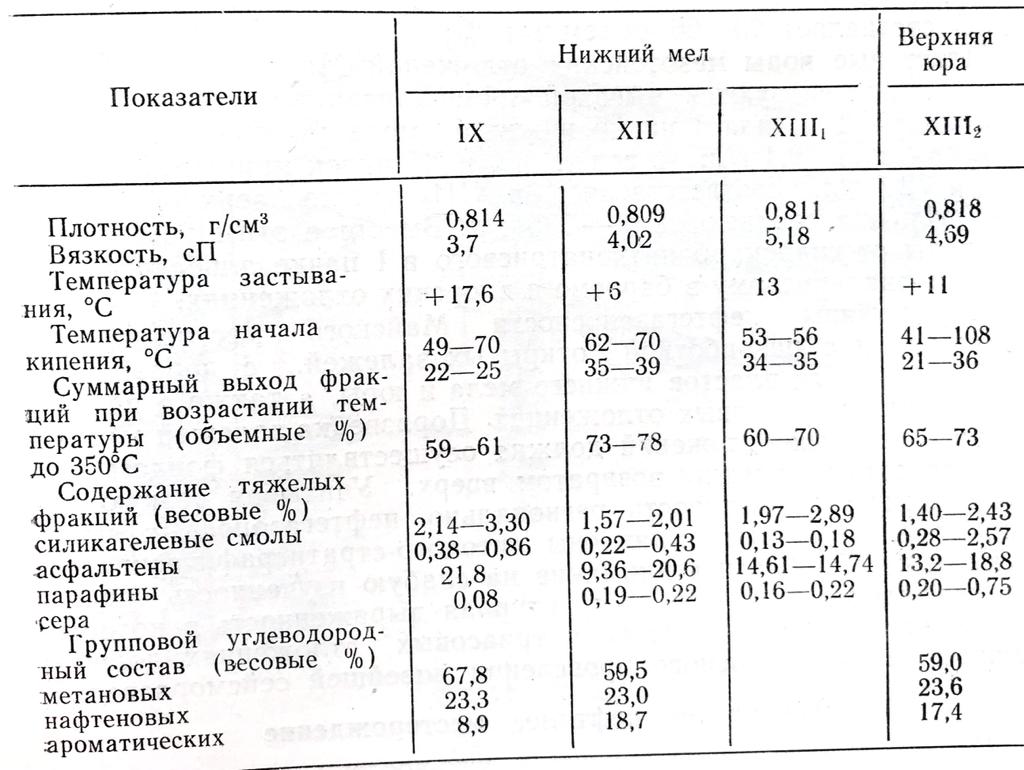 Нефти продуктивных пластов нижнего мела и верхней юры близки по своим физико-химическим свойствам. Все они легкие, метанового типа, с высоким содержанием парафина, малосернистые (таблица 1).
