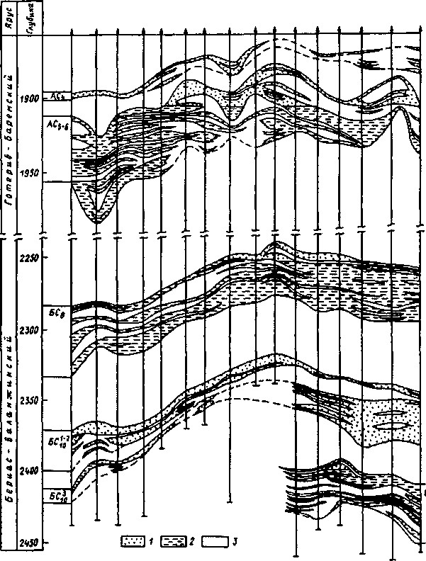 Рис. 1. Мамонтовское нефтяное месторождение. Геологический профиль центральной части месторождения (составил В.А. Туров): 1, 2 — песчаники нефте-, водонасыщенные; 3 — глины