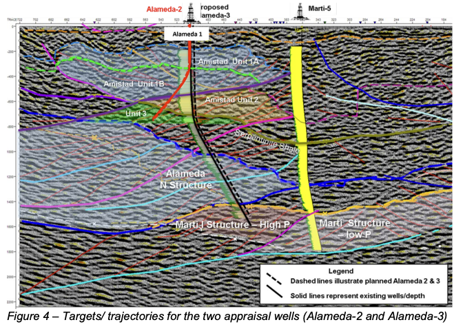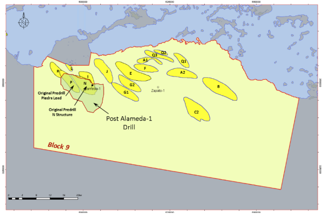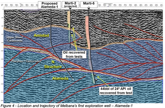 The targets for Melbana’s proposed two well drilling program in Block 9 were selected following an extensive review of the available data, which included several generations of seismic surveys, gravity studies and prior wells. Melbana’s first well, Alameda-1, is targeting the same structure drilled in the late 1980s by CUPET (Cuba’s National Oil Company) with a well they called Marti 5, which itself was a follow up to Marti 1 and 2 – both of which had recorded oil shows. Marti 5 recorded oil shows over an 850 metre gross interval and recovered a lighter oil (24° API) than is typically found in Cuba (the higher the API number, the lighter the oil).