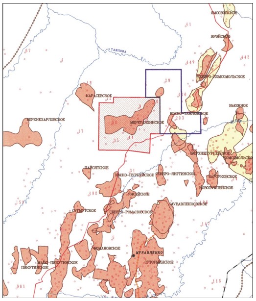 Крупные структуры II порядка: XLV Северный крупный вал, LV Танловско-Пурпейский крупный прогиб, LХХ Пякупурская малая впадина, СLIII Западно-Ямсовейская мезоседловина