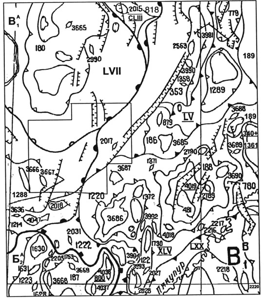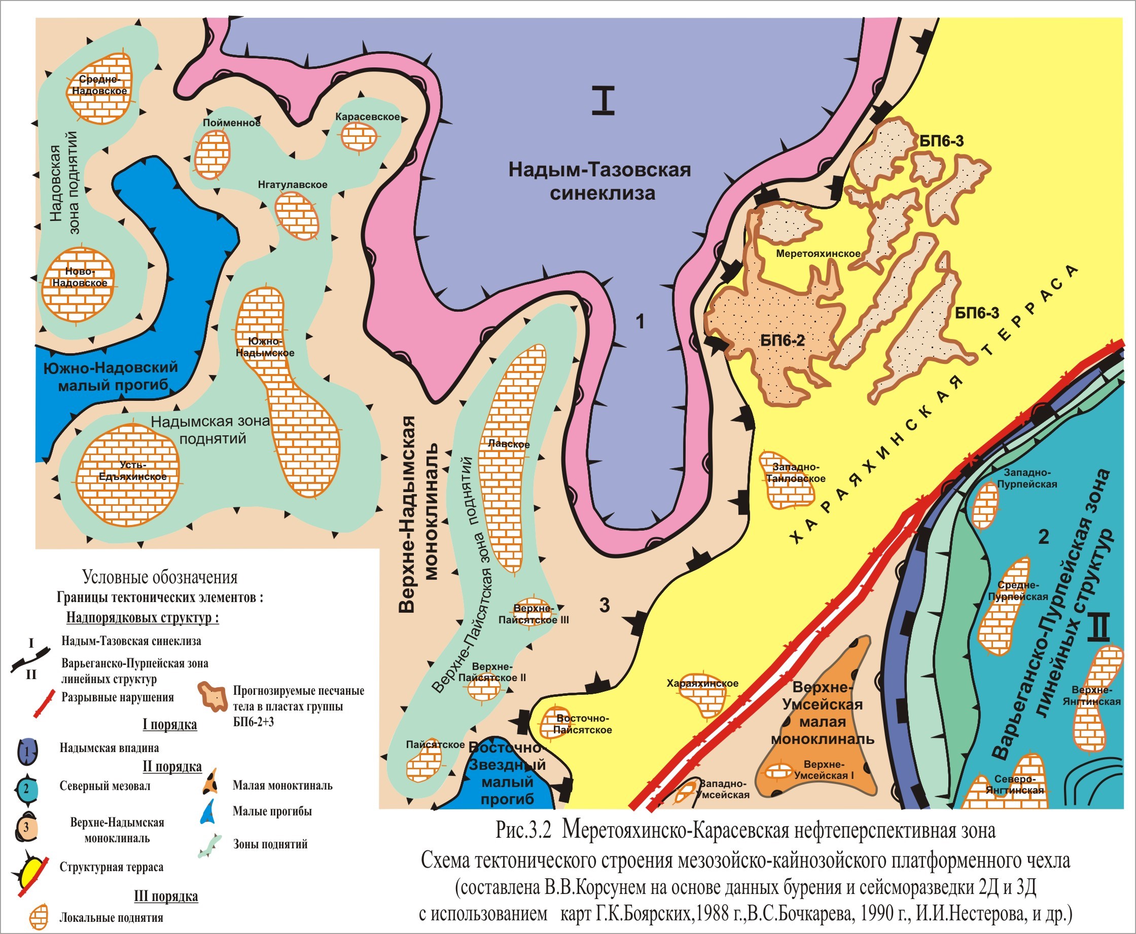 Б2А - Хантейский мегасвод, В1А Надымская мегавпадина, В1в Варьёганско-Пупейская зона линейных структур (антиклинальная зона).