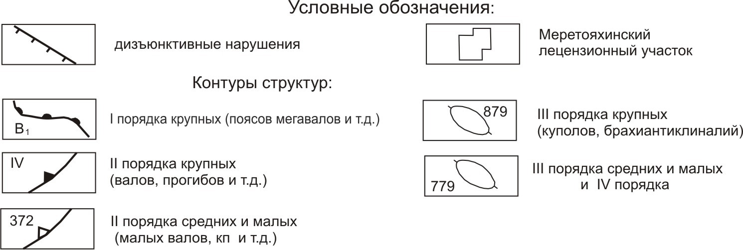 По данным ЦГЭ и сейсморазведочным работам 3Д (компания Халлибуртон) фундамент в районе Меретояхинской площади имеет блоковое строение и характеризуется широким развитием дизъюнктивных дислокаций. По диагонали, с юго-запада на северо-восток, ее пересекают разрывные нарушения. Поверхность доюрского основания в восточной части зоны, в области юго-восточного борта Танловской впадины, выглядит более спокойной в тектоническом отношении (граф. прил. № 72).