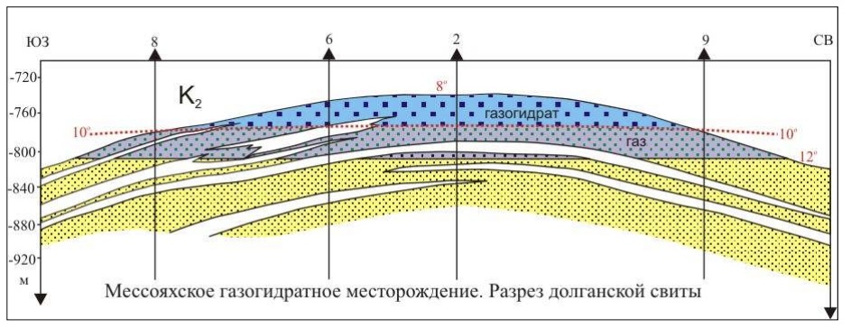 Все это открывает новые возможности для возрождения Мессояхского промысла. Дальнейшая эксплуатация месторождения предусматривает консервацию месторождения сроком на три года с целью уточнения строения залежи Дл1, наличия газовой гидратной шапки, а также поиска залежей углеводородного сырья в меловых и юрских отложениях. В дальнейшем предусмотрена расконсервация месторождения и эксплуатация скважин до минимального устьевого давления (Руст = 8 атм). Последний пересчет запасов производился в 1975 году. В результате эксплуатационного разбуривания месторождения запасы не подтвердились. Таким образом, вопрос о величине начальных и дренируемых запасов остается открытым. Это касается наличия или отсутствия природных газогидратов в долганской свите. Также невыясненным остается вопрос о присутствии в пласте нефтяной оторочки. Для решения данных вопросов на первом этапе необходимо бурение поисково-оценочной скважины в купольной части структуры глубиной 3200 м, с отбором керна из кровельной и подошвенной части пласта Дл1, проведение уплотняющей МОГТ и 3D сейсмики. Бурение скважины позволит также уточнить геологическое строение юрских и меловых отложений, а также определить промышленную значимость юрских отложений. На основе полученных данных, возможно, удастся уточнить геологическую модель строения залежи Дл1 (https://neftegaz.ru/science/development/332316-promyslovo-geologicheskie-osobennosti-messoyakhskogo-gazogidratnogo-mestorozhdeniya/)