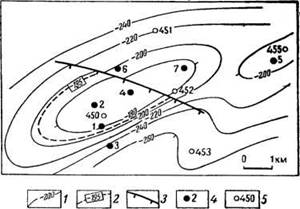 1 — изогипсы кровли VI горизонта; 2 — положение газо-водяного контакта, м; 3 — дизъюнктивные нарушения; 4 — разведочные скважины; 5 — структурно-поисковые скважины
