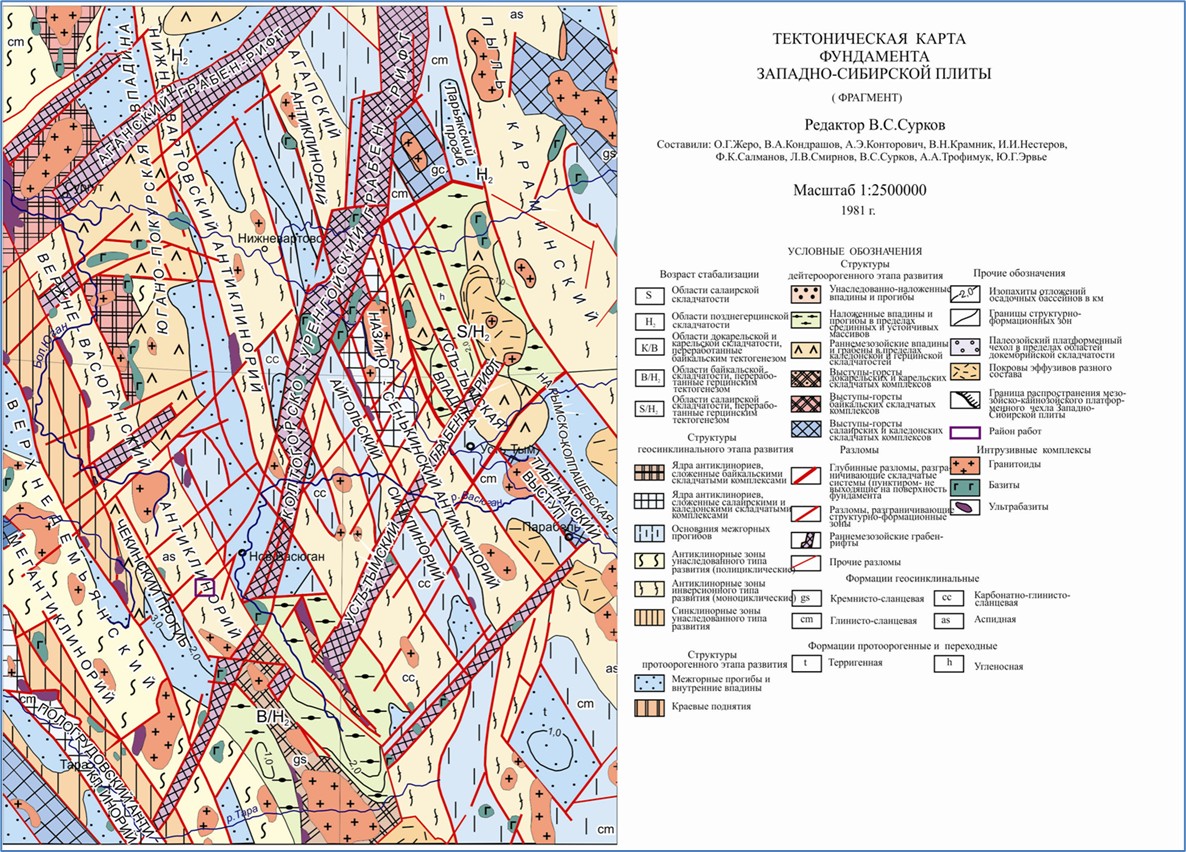 Рис.2. Тектоническая карта фундамента Западно-Сибирской плиты (фрагмент). Редактор Сурков В.С. 1981 г.