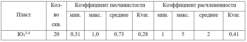 Коэффициент расчлененности по продуктивному пласту изменяется от 1 до 5, в среднем равен 2 (Кvar= 0,41) (Табл. 1). Наибольшее количество песчаных пропластков встречается в юго-западной части залежи в скважине № 53, однородный песчаный пропласток идентифицирован в разрезе скважин №№ 2Р, 9П и 59, которые расположены в юго-восточной части залежи (скв.№№ 9П и 59) и в северной части за контуром основной залежи (скв. № 2Р).
