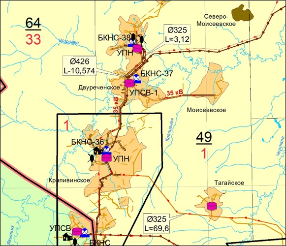 По соседству с Моисеевским находятся несколько месторождений: Крапивинское (на юго-западе), Тагайское (на юге), Двуреченское (на западе). Ближайшими разрабатываемым месторождением является Двуреченское. Схематическая обзорная карта района работ представлена на рисунке ниже.