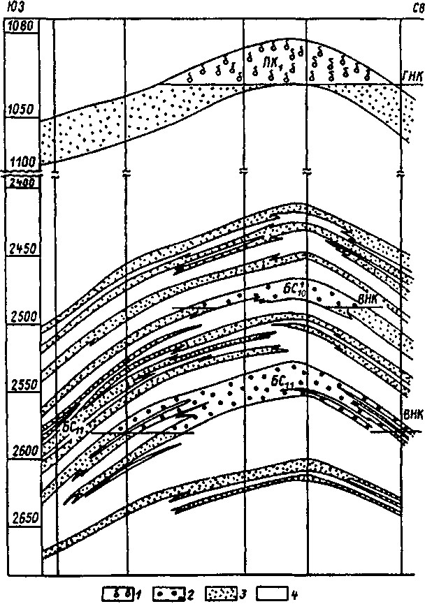 Рис. 1. Муравленковское нефтегазовое месторождение. Геологический профиль месторождения: 1, 2, 3 — песчаник соответственно газо-, нефте-, водонасыщенный; 4 — глина глина
