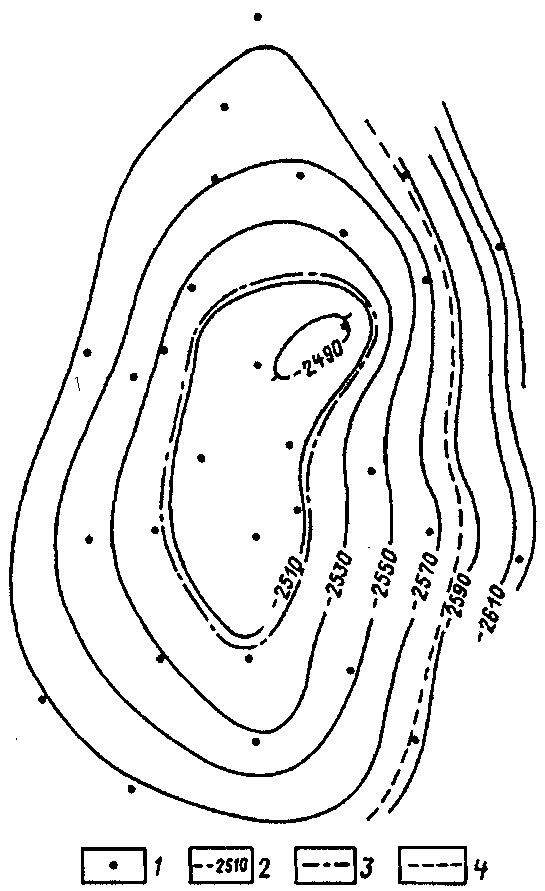 Рис. 2. Муравленковское нефтегазовое месторождение. Структур­ная карта по кровле пласта БС11: 1 — разведочные скважины; 2 — изогипсы кровли пласта БС11; 3, 4 — контуры нефтеносности