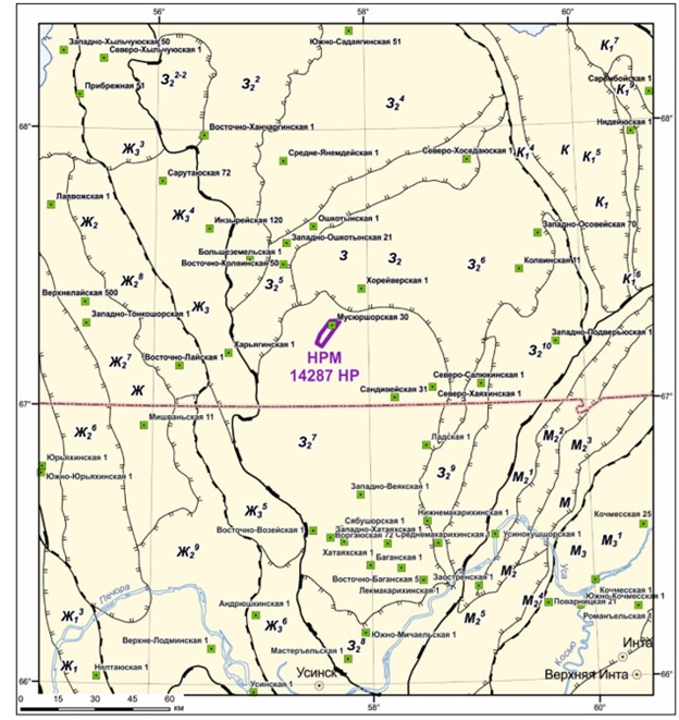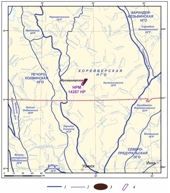 В нефтегазогеологическом отношении Мусюршорское месторождение расположено в пределах Колвависовского нефтегазоносного района (НГР), входящего в состав Хорейверской нефтегазоносной области (НГО) (Рис. 2).