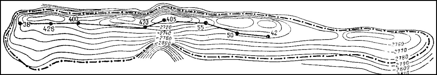 Структурная карта по кровле продуктивного пласта Д-II пашийского горизонта (вверху) и профильный разрез продуктивной толщи девона (внизу)