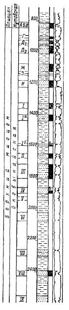 Наиболее крупные залежи нефти приурочены к пластам Г, Д, Ж и IV. Глубина залегания промышленных скоплений нефти и газа 300— 1750 м. Высоты нефтяных залежей изменяются от 20—30 до 250 м (в отдельных блоках). Начальные пластовые давления в залежах соответствовали приведенным гидростатическим; начальные дебиты изменялись от 1 до 54,5 т/сутки, причем максимальные (до 50— 70 т/сутки) дебиты отмечались в залежах пластов Ж, 3, И, I. Начальные газовые факторы составляли 21 —146 м3/т. Все залежи эксплуатировались на режиме растворенного газа; в. настоящее время пластовое давление поддерживается с помощью законтурного и внутриконтурного заводнения.
