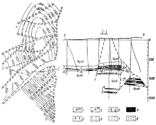 1-изогипсы по кровле IVпласта, 2- разрывы, 3- контуры: а- газоносности, б -нефтеносности, 4- нефть, 5- газ, 6,7,8- песчаные, глинистые и песчано-глинистые породы соответственно.
