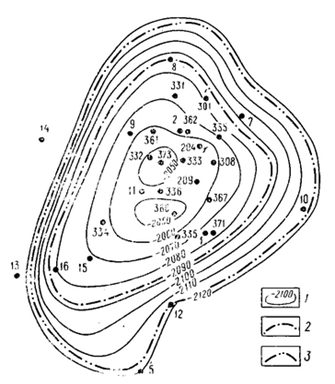 1 – изогипсы в м; 2 – внутренний контур газоносности; 3 – внешний контур газоносности