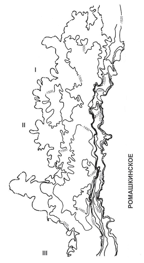 I, II, III – площади соответственно Акташская, Ново-Елховская, Федотовская; линии с точкой – внешние контуры нефтеносности залежей.