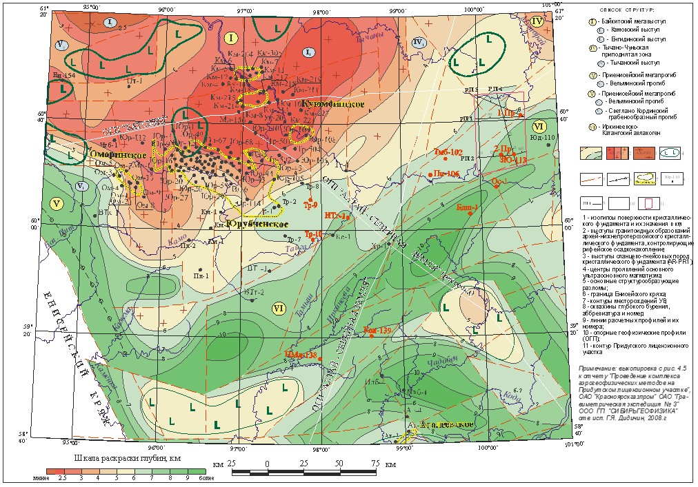 Рис.4. Структурно-тектоническая схема поверхности кристаллического фундамента юго-западной части Сибирской платформы
