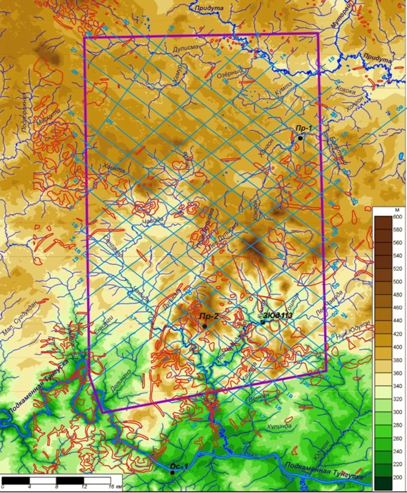В тектоническом отношении по эрозионной поверхности фундамента Придутский лицензионный участок расположен в юго-восточной части Тычано-Чуньской приподнятой зоны, осложняющей восточное окончание Байкитской антеклизы (рис. 4). Прогнозируется, что рельеф поверхности кристаллического фундамента здесь ступенеобразно погружается с севера на юг, восток и юго-восток от 4.5 км до 7.0 км и глубже в сторону Иркинеевско-Катангского авлакогена. Придутский участок расположен в пределах приподнятого блока субмеридианального простирания - Придутского выступа, который осложнен в центральной части Дулисьминским грабенообразным прогибом, разделяющим Придутский и Хоткинский выступа.