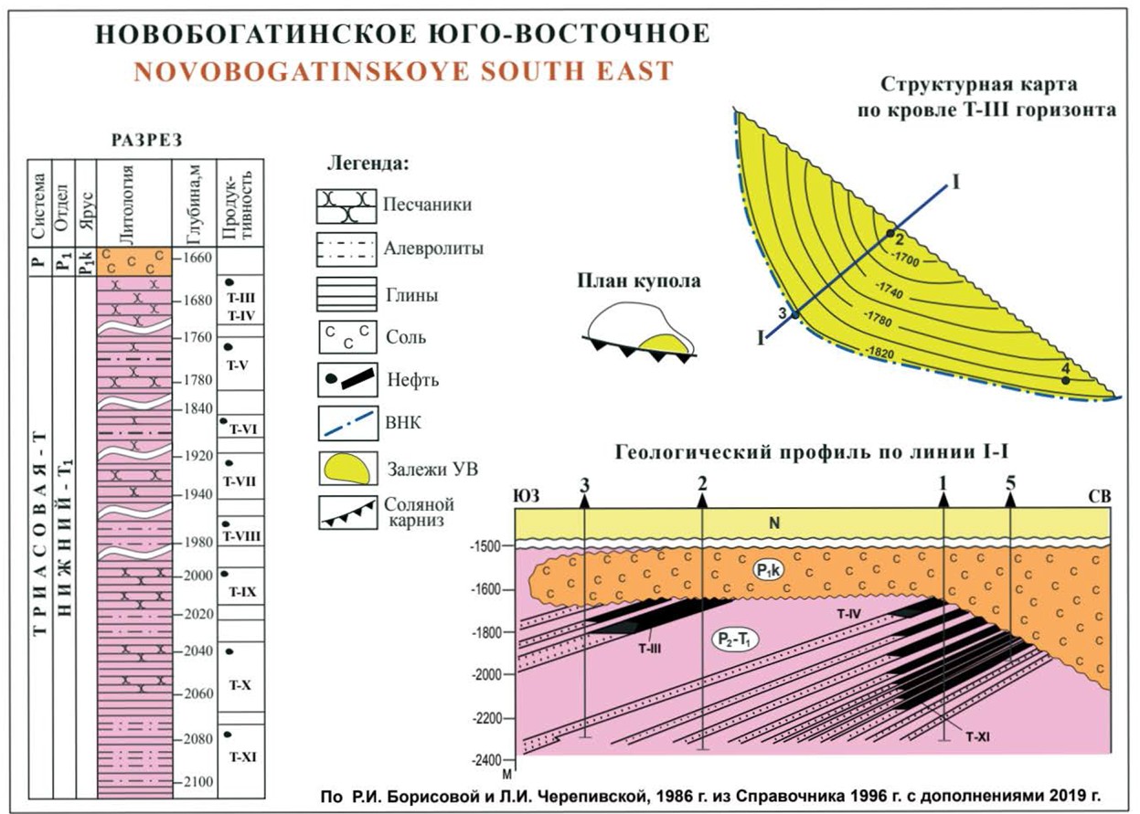 Рис.1.Нефтяное месторождение Новобогатинское Юго-Восточное (по материалам Р.И. Борисовой, Л.И. Черепивской, 1986г.)