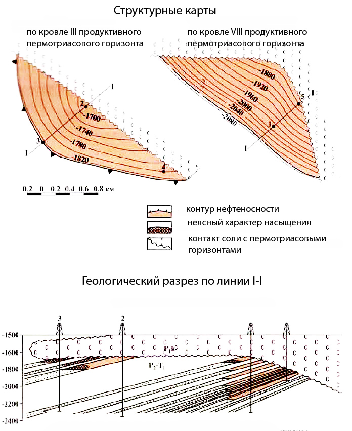 В про рваных и частично перекрытых солью пестроцветах пермотриаса на глубине 1600-2100 м выявлено 11 нефтяных горизонтов. Все они экранируются соляным карнизом. Коллекторами являются песчаники и алевролиты. Нефтенасыщенные толщины по горизонтам составляют 2,2-25,6 м. При их испытании начальные дебиты нефти составляли 2,8-57,6 м3/сут при 5 мм штуцере. Начальный газовый фактор для всех горизонтов 2500 м3/м3 . Начальное пластовое давление 15,1-23,6 МПа, температура пластов 42-51 °С. Плотность нефти составляет 795-852 кг/м3. Нефть малосернистая, содержание серы - 0,05-0,24 %, содержание смол - до 16 %.