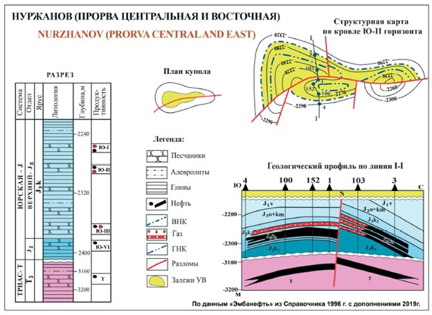 Нефтегазоконденсатное месторождение Нуржанов (Прорва Центральная и Восточная) находится на крайнем юге Южно-Эмбинской НГО. В структурном отношении месторождение приурочено к глубоко погруженному соляному куполу субширотного простирания. В надсолевом комплексе пород прослеживается брахиантиклиналь, нарушенная разломами. Установлена продуктивность триасовых и юрских отложений.