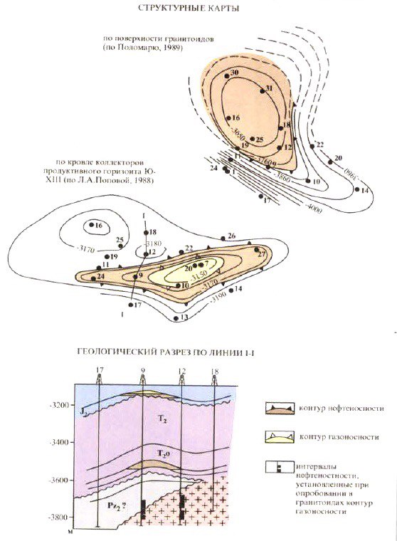 Месторождение приурочено к субширотно ориентированной брахиантиклинальной складке, в пределах которой доказана нефтеносность верхней части выветрелых гранитов каменноугольного возраста, терригенно- карбонатной толщи среднего триаса и песчаников нижней юры (рис. 1). В выветрелых гранитах залежь литологически ограниченного типа; в триасе - залежь пластовая, сводовая, связанная с карбонатным коллектором трещинного типа; в нижней юре залежь пластовая, сводовая, связана с пластом песчаников.