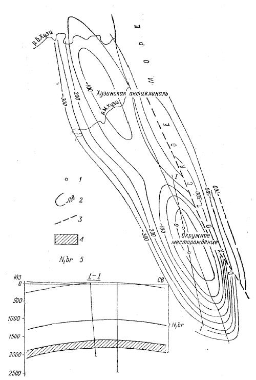 Рис. 1. Окружное нефтяное месторождение. 1- 'Поисковые скважины, давшие нефть; 2— изогипсы по электрореперу внутри верхней части борской свиты; 3 — разрывы; 4 — нефтеносный горизонт; 5 — борская свита.