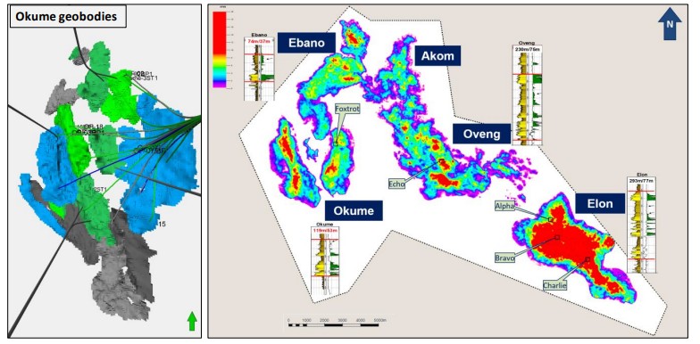 Okume geobodies (left) and location of field within the Okume complex (right)