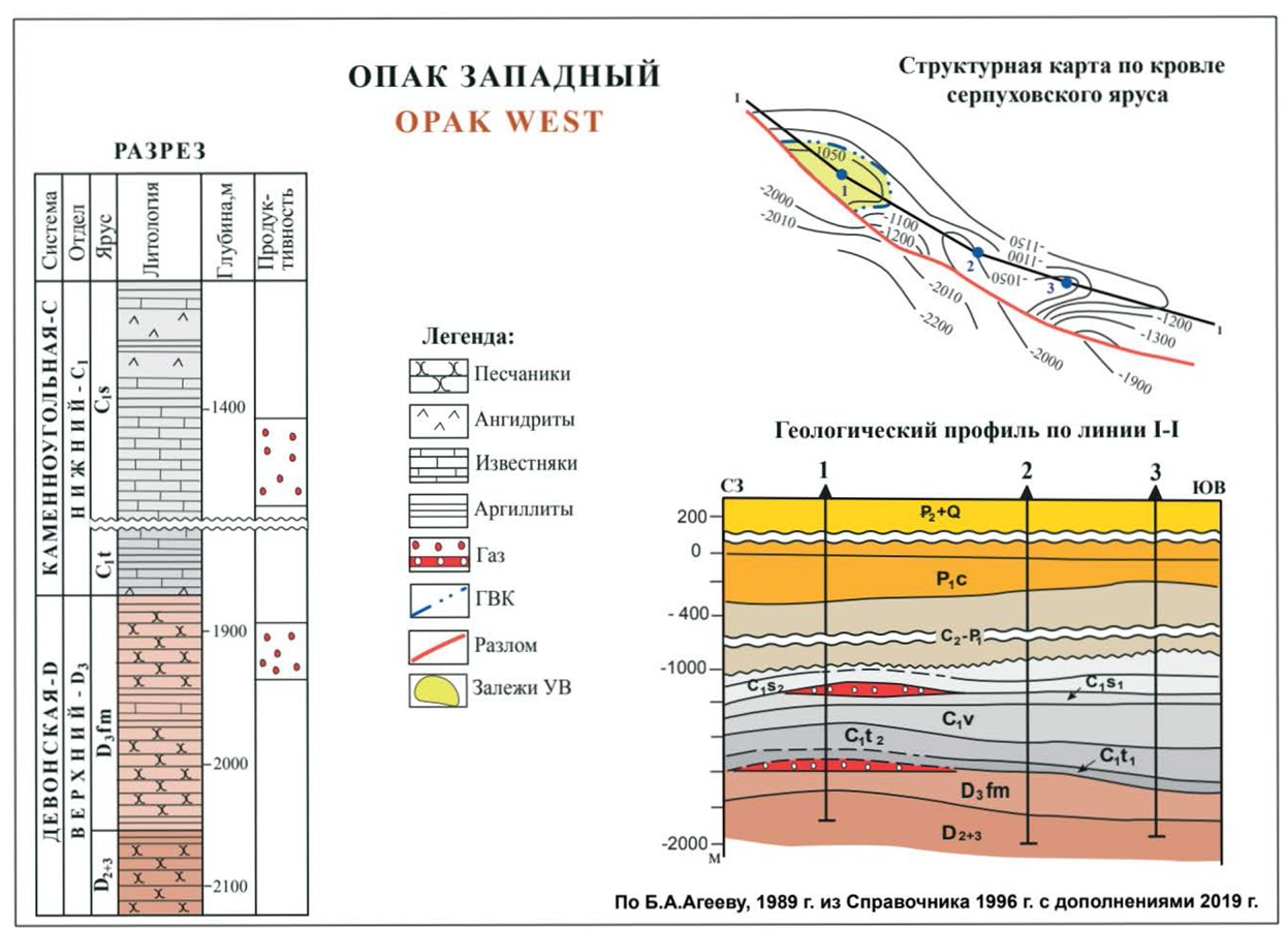Газовое месторождение Опак Западный находится на юго-востоке Кокпансорского прогиба Шу-Сарысуйской впадины. В структурном отношении месторождение приурочено к протяженной приразломной антиклинали северо-западного простирания. Сводовая часть складки осложнена двумя куполовидными поднятиями. Разрез сложен терригенно-карбонатными породами девонского, каменноугольного и пермского возраста. Размеры антиклинали по кровле девонских отложений составляют 15 х 3.2 км при амплитуде 173 м. Продуктивными являются девонские и серпуховские отложения на северо-западном куполе структуры.